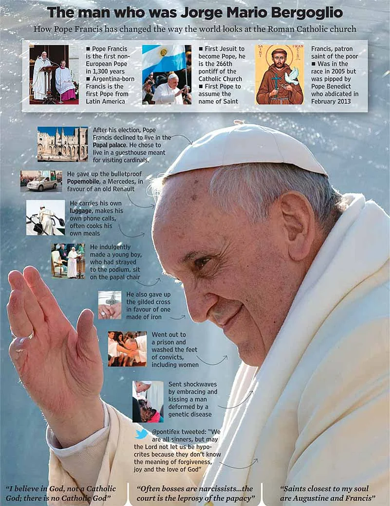 Yet there was no going back on simple human concerns. He once told an interviewer that “the two most serious evils afflicting the world today are unemployment of the young and the loneliness of the old”. The reply, to a question on the challenges before the Catholic Church, resonated across the world and especially in India, where half the population is under 25. Neither statesmen nor religious leaders, here or elsewhere, had given voice to the angst of the age quite so forcefully. A parish priest in an Italian town exclaimed that in over 35 years of service he had till now never witnessed people coming up to him on the streets to ask how they could be of some help to the poor, enough proof that the Pope’s words have found an echo. The pontiff has reached out to non-Christians and gays too, famously asking “Who am I to judge?” if a homosexual reached out to God. While the church remains opposed to same-sex unions and abortions, the shift is visible on the ground.Indeed, after the Indian Supreme Court upheld a 150-year-old law that deemed homosexuality a crime, Cardinal Oswald Gracias of Goa, one of the eight cardinals appointed by the Pope to advise him, asserted the church had never considered the gay community as criminals.