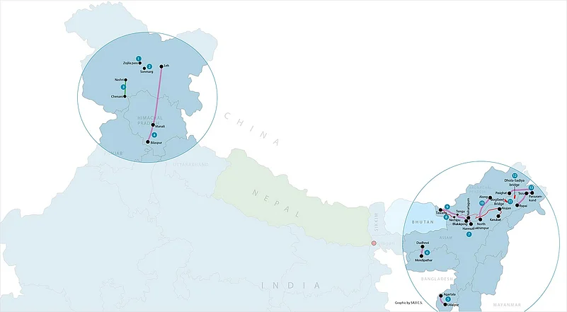 The other strategic lines for which the surveys have started are Bhalukpong-Tenga-Tawang, North Lakhimpur-Bame-Along-Silapatha and Pasighat-Tezu-Parsuramkund-Rupai. Even as the funds for the strategic lines will come from the MoD, the railway ministry is also executing projects worth Rs 90,000 crore in the Northeast to put the creaky infrastructure along the Line of Actual Control (LAC) on track. These include surveys for seven new broad-gauge lines—594 km-long in all—in Arunachal Pradesh alone. Projects worth another Rs 3,000 crore are being implemented in other Himalayan states, including Jammu and Kashmir, that share a border with China.