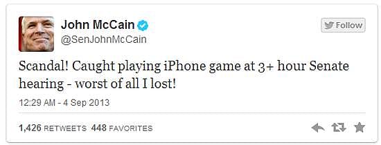 In September 2013, US Senator John McCain, who is considered to be the lodest voice in the Us politics in favour of intervention on behalf of Syrian rebels, was caught playing Poker during the Syria war debate. McCain was caught by a Washington Post photographer playing poker on his iPhone during the hearing.
