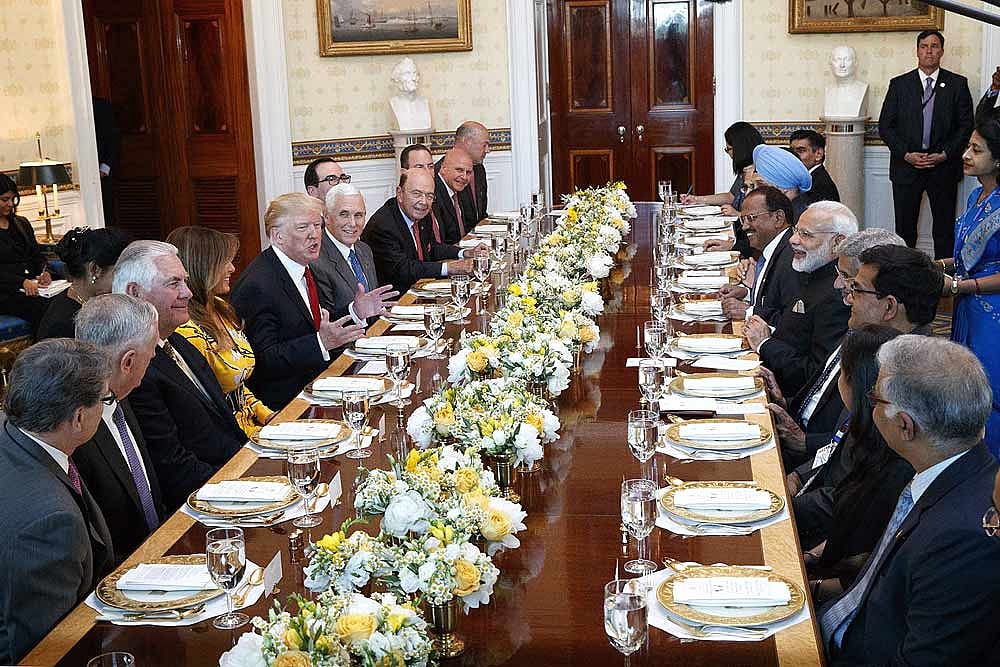 Modi’s two-day stay in the US reverberated with hand clasps and happy talk. Business matters were high on the agenda and he met a number of American CEOs. The premier also had two meetings with the president and became the first foreign dignitary to be hosted for dinner in the Trump White House. The two leaders issued a joint statement, touching on trade and terrorism, in the lush greens adjacent to the Oval Office—during which Modi eagerly, if awkwardly, hugged Trump.