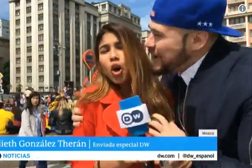 Colombian journalist Julieth Gonzalez Theran was reporting from the Russian city of Saransk when a man appeared suddenly, one hand grabbing her arm and the other her breast while kissing her on the cheek.