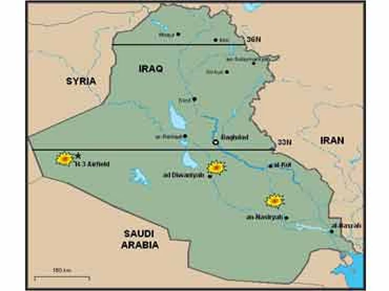 FA-18s and F-16s dropped precision- guided weapons against the cable repeater sites as marked, theEasternmost ones on the map. These sites are part of the air defense communications network and system inIraq. Concerning the Westernmost mark out there where it says H-3 Airfield, in an earlier response, F-15Esdropped munitions against a Flat Face air defense radar near that airfield in western Iraq, and we have avideo of that.