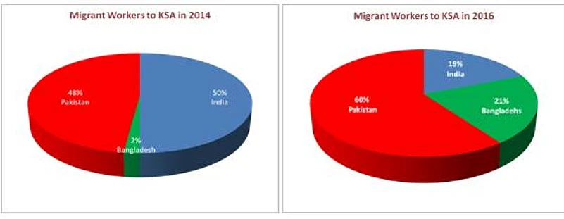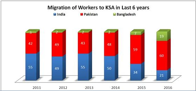 Till 2014, (the year around which India introduced two new regulations for Indian migrant workers), Pakistan and Bangladesh were sending around 3 lakh and around 10 thousand workers respectively to the Saudi Arabia. All of a sudden in 2015-16 though, Pakistan registered a sharp rise to 5 lakh and Bangladesh witnessed an increase from 60,000 in 2015 to 1.4 lakh in 2016.
