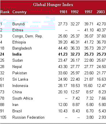 For most people, Sudan conjures up images of ethnic cleansing in its westernDarfur province, stark poverty and hunger. But in what will undoubtedly come asa rude shock to India, a Global Hunger Index developed by the International FoodPolicy Research Institute says the problem of malnutrition is more severe inIndia than in the African nation.