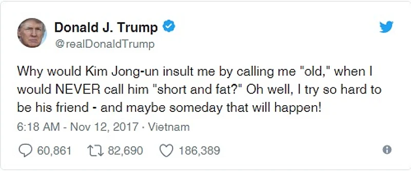 In a response to North Korea calling Trump’s speech in South Korea “reckless remarks by an old lunatic,” Trump tweeted from Hanoi on Sunday morning: “Why would Kim Jong-un insult me by calling me ‘old,’ when I would NEVER call him ‘short and fat?’“