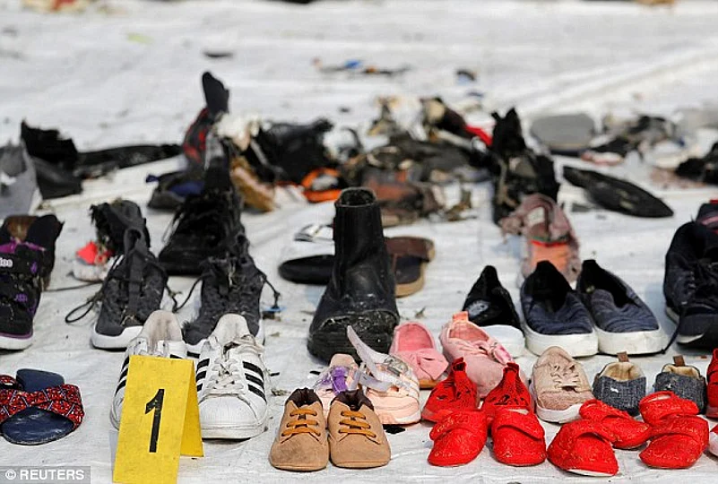 There was a devastating scene of footwear earlier worn by passengers on flight JT610 which had been laid out on white canvas and numbered (Image: Reuters)