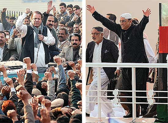 Which way the wind? PML(N) leader Nawaz Sharif in Muzaffarabad; Zardari on Benazir’s fourth death anniversary. (Photograph by AFP, From Outlook 06 May 2013)