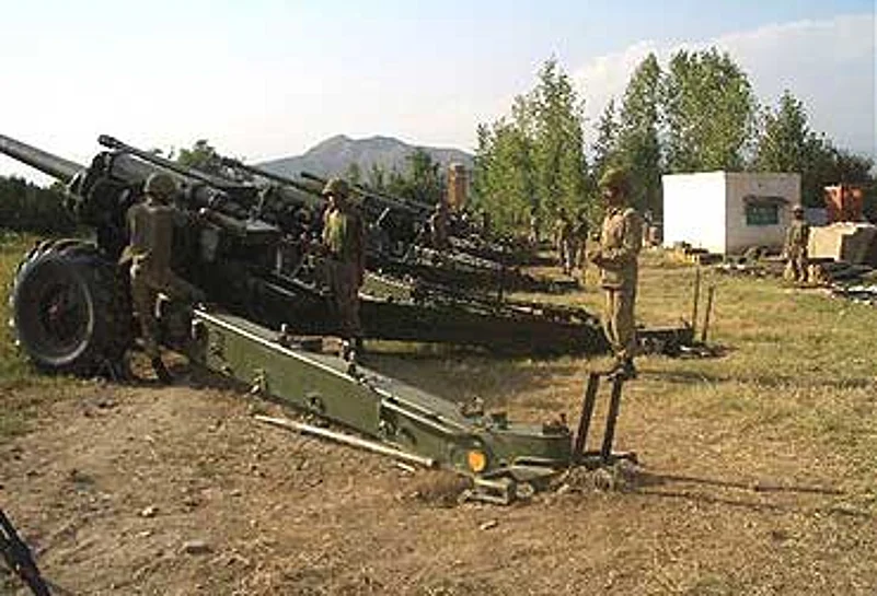 Soldiers of the Pakistan army stand next to artillery in the troubled tribal area of Bajaur in Pakistan