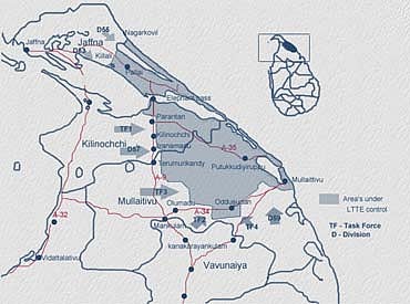 Meanwhile, at the time of writing, the troops attached to Task Force-IV, operating in the East of the Jaffna-Kandy (A-9) Road, have captured the key junction town, Oddusudan, on the Mankulam-Mullaitivu (A-34) Road, taking full control of the Oddusudan-Nedunkerni-Puliyankulam Road, and are surging ahead, just four kilometres away from the centre of the LTTE’s military bastion at Mullaitivu. About 30,000 troops are also currently deployed in Kilinochchi to clear the town of booby traps and landmines.