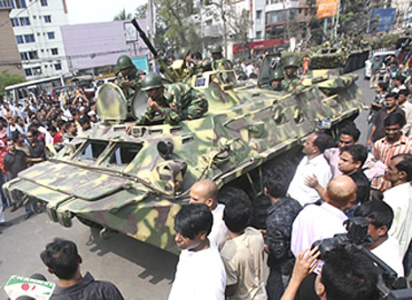 Then in a remarkably free and fair election towards December-end, Hasina’s Awami League, which leans towards India in its policy, swept to power, making the BNP-Jamaat extremely nervous. Add to this Hasina’s steelydetermination to try for war crimes those who committed atrocities during the liberation of Bangladesh in 1971. Some Jamaat leaders too are expected to face trial. Says former diplomat Naresh Chandra, "The bottled-up resentment in the BDR against the army could have been a valid reason for the mutiny. But mischievous elements close to Khaleda Zia could also have played their part in fanning the violence."