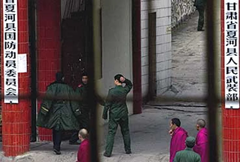 Tibetan monks walk past the military headquarters along the main street of Xiahe, western China's Gansu province on April 3, 2008