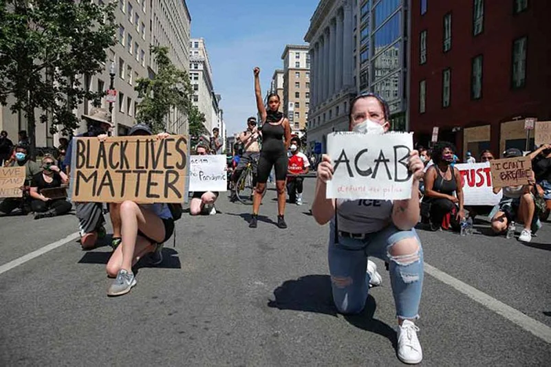 Demonstrators kneel as they protest the death of George Floyd, in Washington. AP/PTI Photo