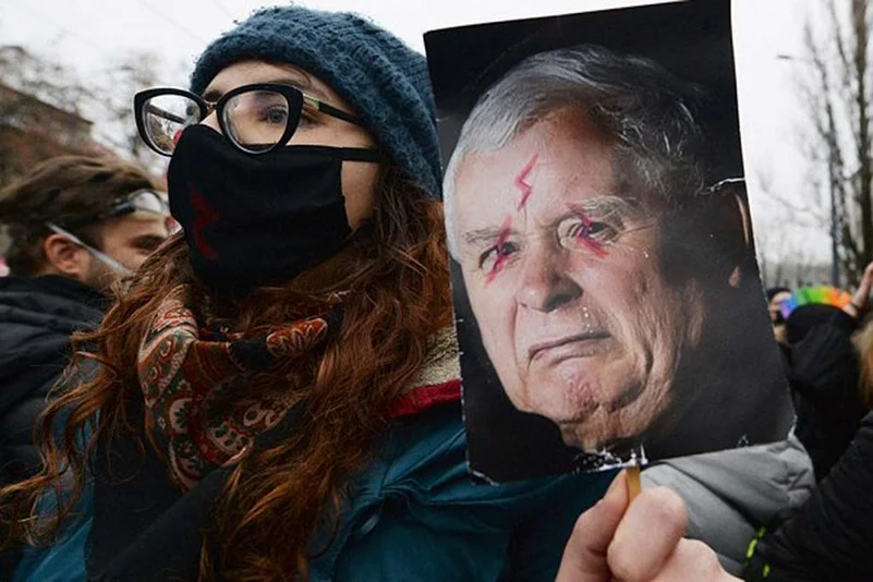 Protesters hold up images of the ruling party leader, Jaroslaw Kaczynski, with lightning bolts (the symbol of the Anti-abortion ban movement) in Warsaw, Poland. AP/PTI Photo