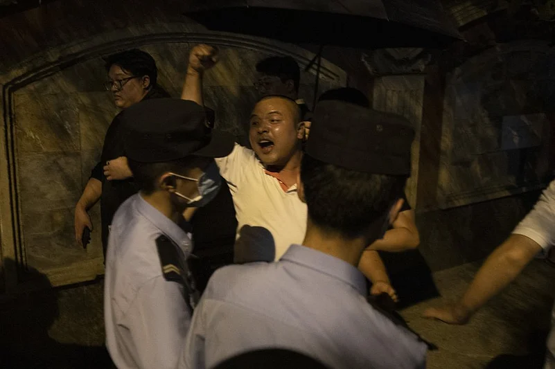 A man who tired to unfurl a large placard late Sunday that he called an open letter to the Chinese government was quickly taken away.