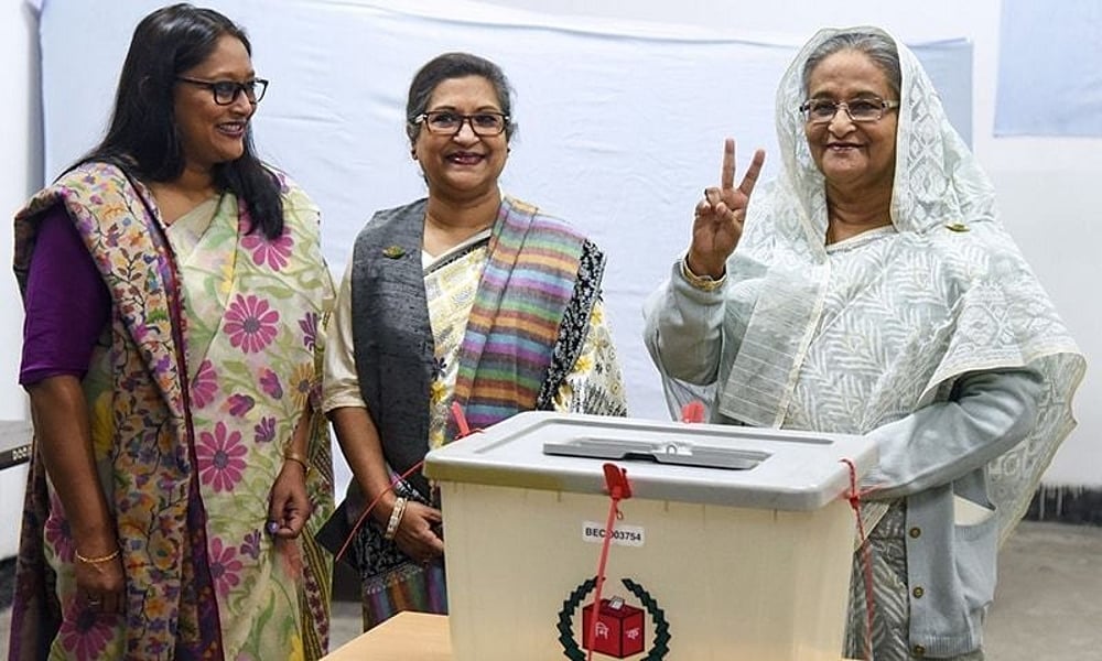 Bangladesh Prime Minister Sheikh Hasina on Sunday elected virtually unopposed from the Gopalganj-3 constituency as she won by a landslide, bagging 229,539 votes while her main BNP opponent could manage just 123.