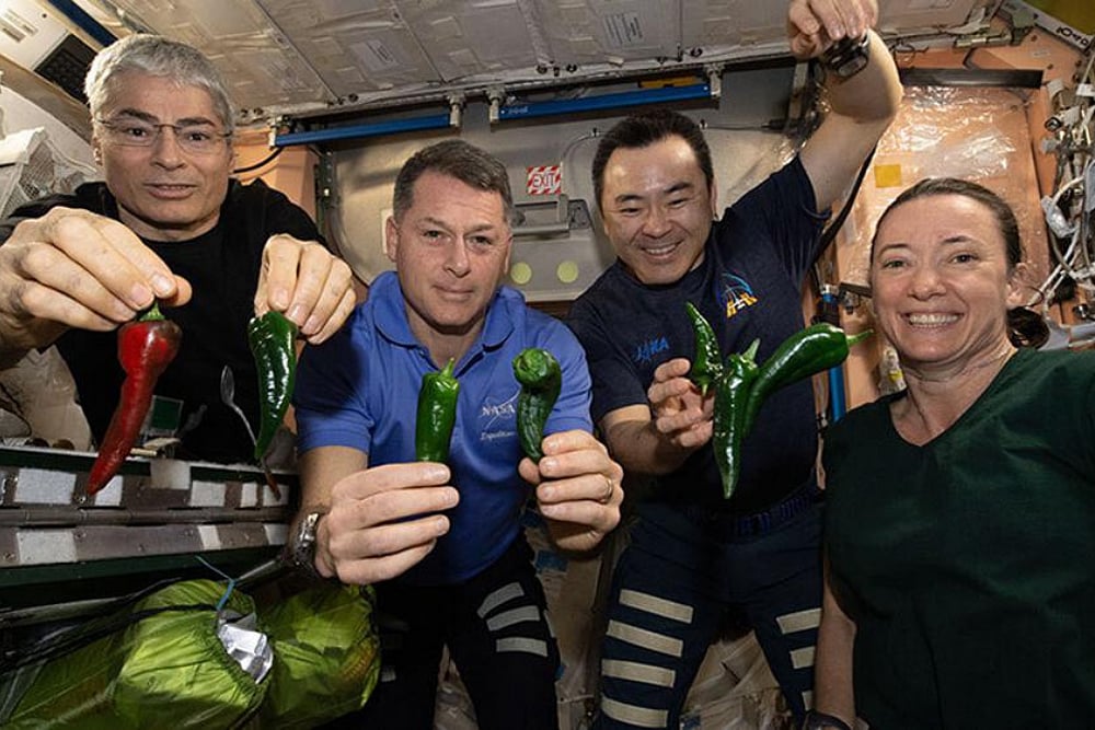 On the culinary side, the astronauts grew the first chile peppers in space — “a nice moral boost,” according to McArthur. They got to sample their harvest in the past week, adding pieces of the green and red peppers to tacos.