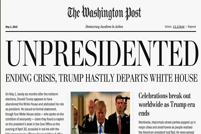 The fake newspaper with six column large headline 'Unpresidented: Trump hastily departs White House, ending crisis' was dated May 1, 2019.