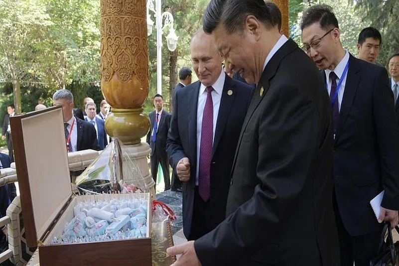 Russian President Vladimir Putin presented his Chinese counterpart Xi Jinping with a giant box of ice cream for his 66th birthday before a summit in Tajikistan on Saturday, the Kremlin said, in a sign of the pair's warm ties.
