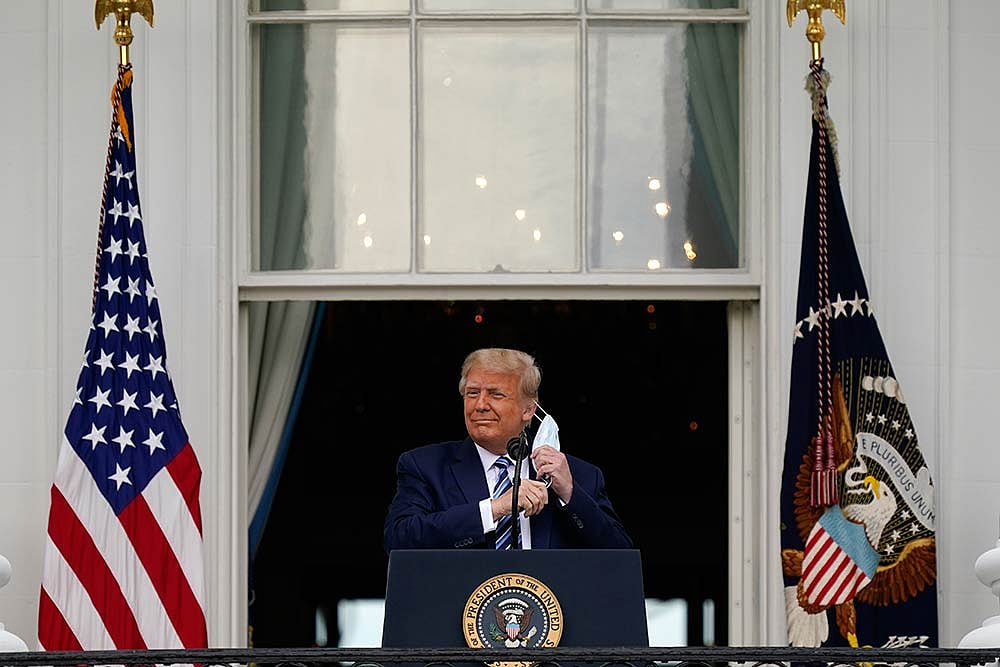 Trump took off a mask moments after he emerged on the balcony to address the crowd on the lawn below, his first step back onto the public stage with just more than three weeks to go until Election Day.