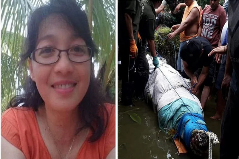 According to media reports, Deasy Tuwo, 44, was feeding croc Merry early on Friday morning at the CV Yosiki Laboratory in Indonesia when the beast appears to have reared and leapt up an 8ft high concrete wall, pulling her into the water.