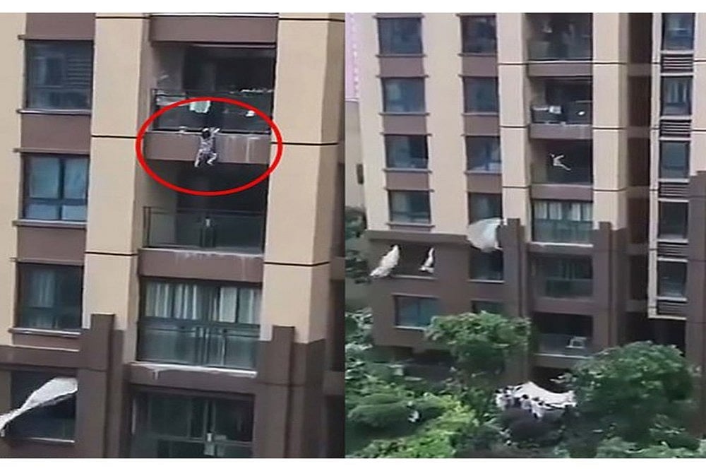 Nail-biting footage showed the moment when the boy lost his grip and fell. The blankets caught the falling child. China's state broadcaster CCTV reported that the toddler had no injuries.