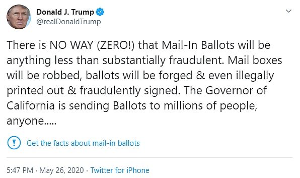 Under the tweets, there is now a link reading “Get the facts about mail-in ballots” that guides users to a Twitter “moments” page with fact checks and news stories about Trump's unsubstantiated claims.