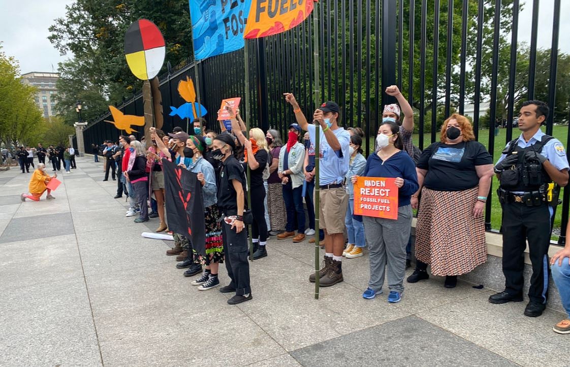 More than a dozen protesters linked arms and sat along the White House fence line Monday to call on the Biden administration to do more to combat climate change and ban fossil fuels. Others cheered and chanted in support from across the street as police blocked off the area with yellow tape and arrested the seated protesters.
