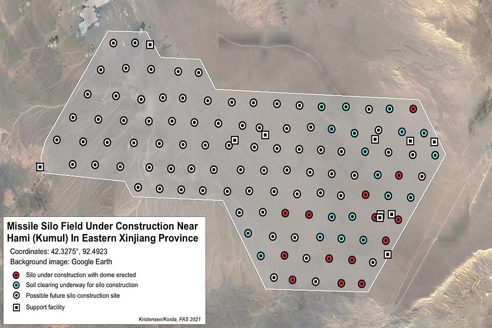 Citing commercial satellite imagery, the FAS report stated that at least 14 silos in the new field have dome shelters over them and soil has been cleared in preparation for construction of another 19 silos. The grid-like outline of the entire complex indicates that it may eventually include approximately 110 silos, the report stated.