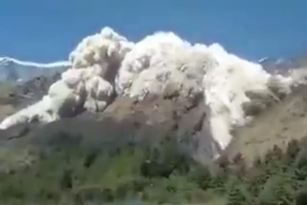 In the video, a massive plume of snow can be seen spreading down the top of a mountain in an otherwise calm and scenic view. Shrieks of onlookers can be heard from the background in the video.
