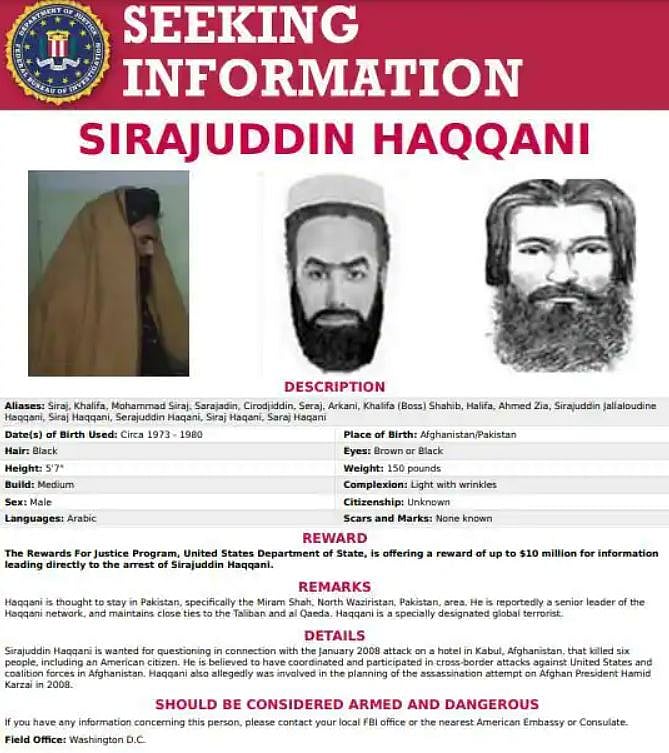 According to the FBI website, the US Department of State is offering a reward of up to $5 million for information leading directly to the arrest of Sirajuddin Haqqani, who is thought to stay in Pakistan, specifically the Miram Shah area in North Waziristan, and maintains close ties to the Taliban and al Qaeda.
