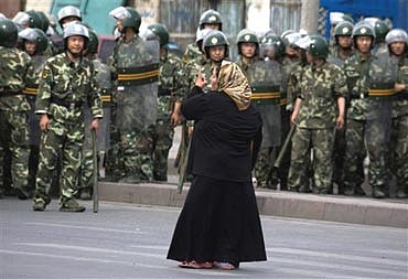 An Uighur woman faces off with Chinese paramilitary police in Urumqi