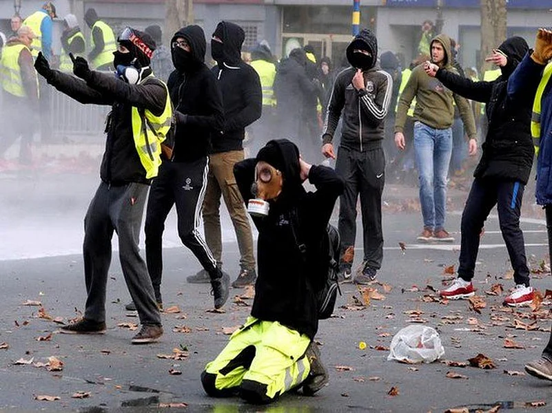 Protesters in the capital set fire to cars, burned barricades and smashed windows in pockets of violence, clad in their emblematic luminous safety jackets, as armoured vehicles rolled through the streets.