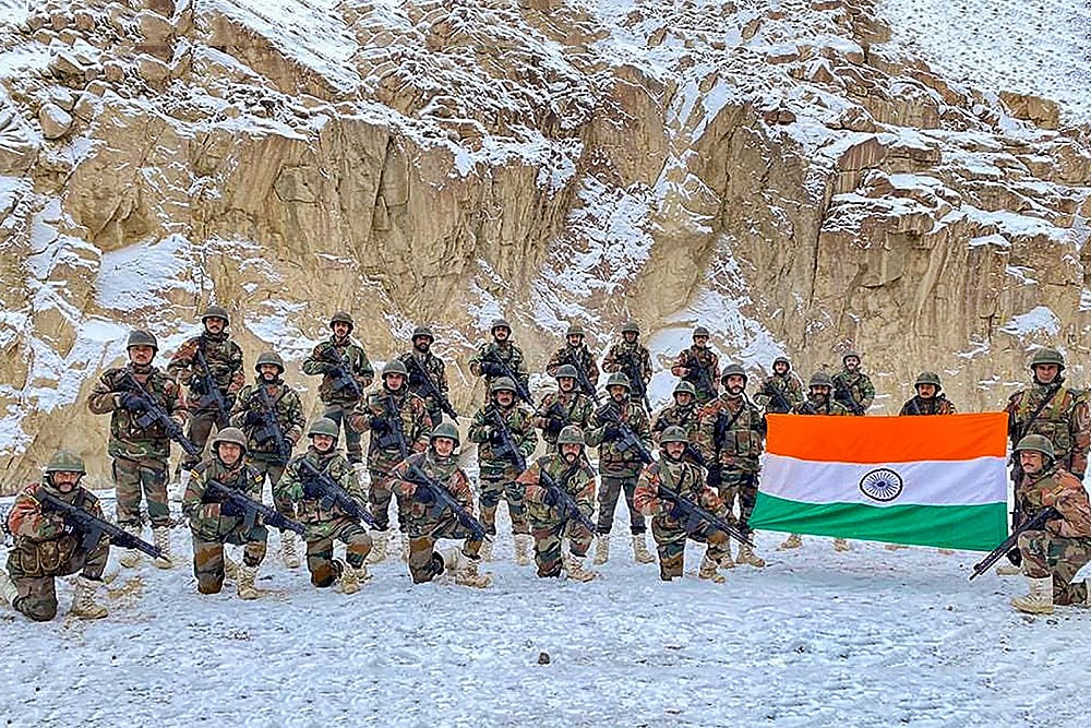 Photographs of Indian Army troops holding a large tri-colour at the Galwan Valley in eastern Ladakh as part of the New Year celebration were released on Tuesday by sources in the security establishment.