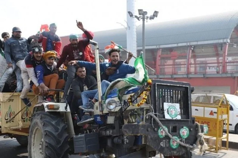 Farmers on their tractors move towards Delhi during their rally on Republic Day, at Singhu border in New Delhi.
