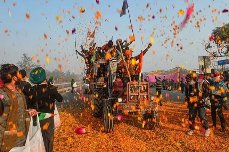 Farmers shower flower petals on fellow farmers riding on their tractors after breaking the police barricades at Singhu border during the 'Kisan Gantantra Parade' on Republic Day, in New Delhi.