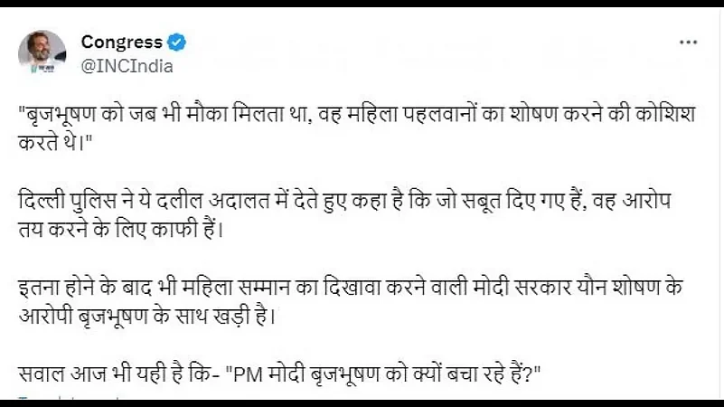 In a post on ‘X’, Congress alleged that Modi government supported Brij Bhushan despite the strong accusations against him by female wrestlers.