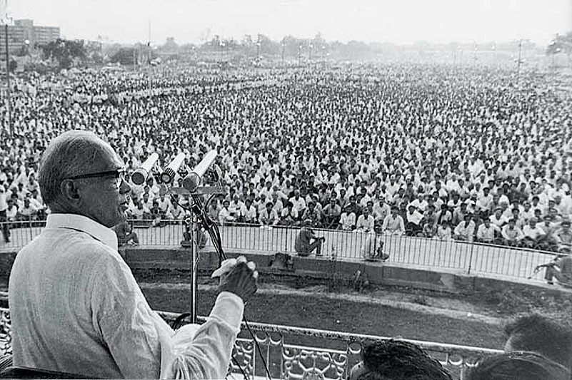 It was true. The Navnirman wasn’t the first mass movement against an elected government. There had been several protest movements against specific public policies in Nehru’s time. Like the mass movements in 1956 organised by the Samyukta Maharashtra Samiti and the Maha Gujarat Janata Parishad for the division of then Bombay state into Maharashtra and Gujarat. The movements sprang up spontaneously, swelled, accomplished their goal, then faded out, with their leaders seamlessly integrating into the political process. Likewise with the mass movement to oppose the imposition of Hindi as the sole official language.