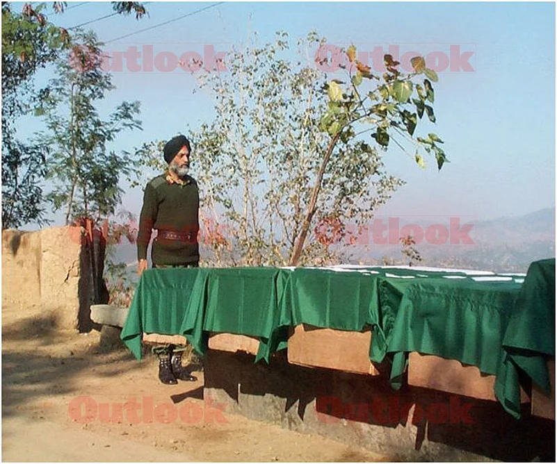 Brig Jasbir Singh, SM, Commander Pallanwala BDE salutes coffins of Pak soldiers before handing over the bodies to Pak Army, at Chakla