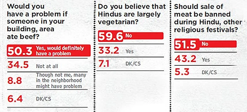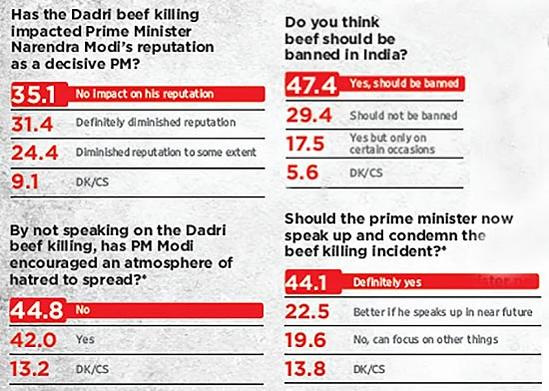 Outlook commissioned Drshti Strategic Research to conduct an opinion poll in the aftermath of the Dadri beef killing. Drshti conducted 1,192 face-to-face interviews in 10 cities on October 6-8. The cities are: Delhi, Mumbai, Bangalore, Lucknow, Ludhiana, Ahmedabad, Hyderabad, Chennai, Calcutta and Srinagar. The sampling was spread across different areas in each city to ensure representation. Also, across age cohorts (18+ yrs), socio-economic class bands (A to D), gender (63% male, 37% female) and religions (67% Hindus, 19% Muslims and 10% Christians). The sample had 29% vegetarians, 5% egg-eating vegetarians and 66% non-vegetarians. The sampling error is under 3 per cent at 95 per cent confidence.