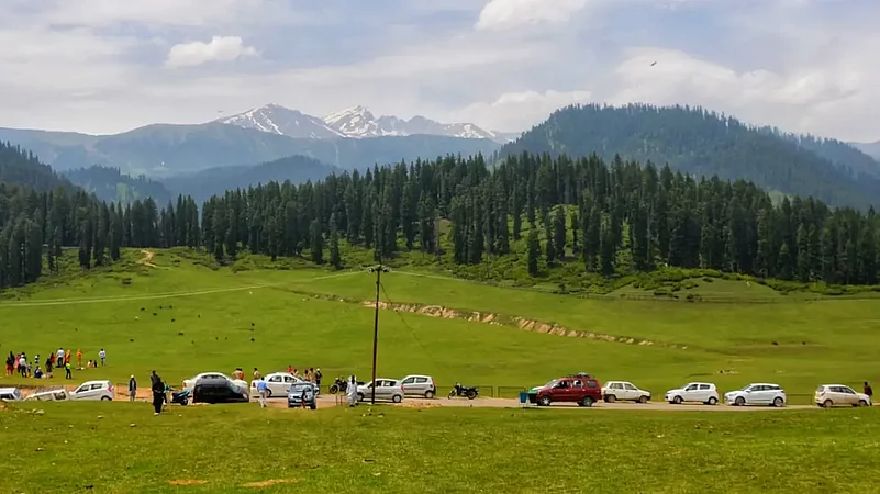 A large number of tourists prefer to go sightseeing in the grass green fields after parking their vehicles on the road that divides the meadow itself. Instead of birds chirping, there is the noise of rushing vehicles. Tourists are all smiles seeing green grass fields surrounded by deodar and pine trees and a gushing stream down the hill.