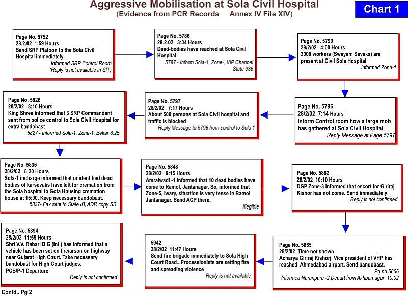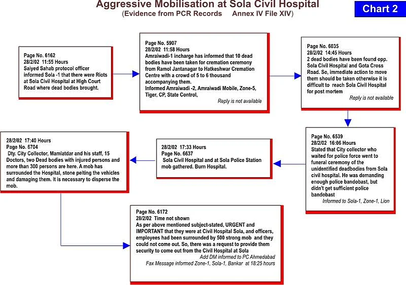 Evidence from Police Control Room (PCR) records submitted by Mr. PC Pande to the SIT after 15.3.2011 reveal cynical and cold-blooded mobilization of RSS workers and VHP men at the Sola Civil hospital from 4 a.m. onwards on 28.2.2002 in aggressive anticipation for the arrival of the dead bodies. Repeated PCR messages, that the home department under Mr. Modi (A-1, who held the home portfolio) and Mr PC Pande (A-21) were trying to conceal, show that both in Ahmedabad and in several locations all over Gujarat crowds were mobilized to aggressively parade bodies with bloodthirsty sloganeering, inciting mobs to attack innocent Muslims.
