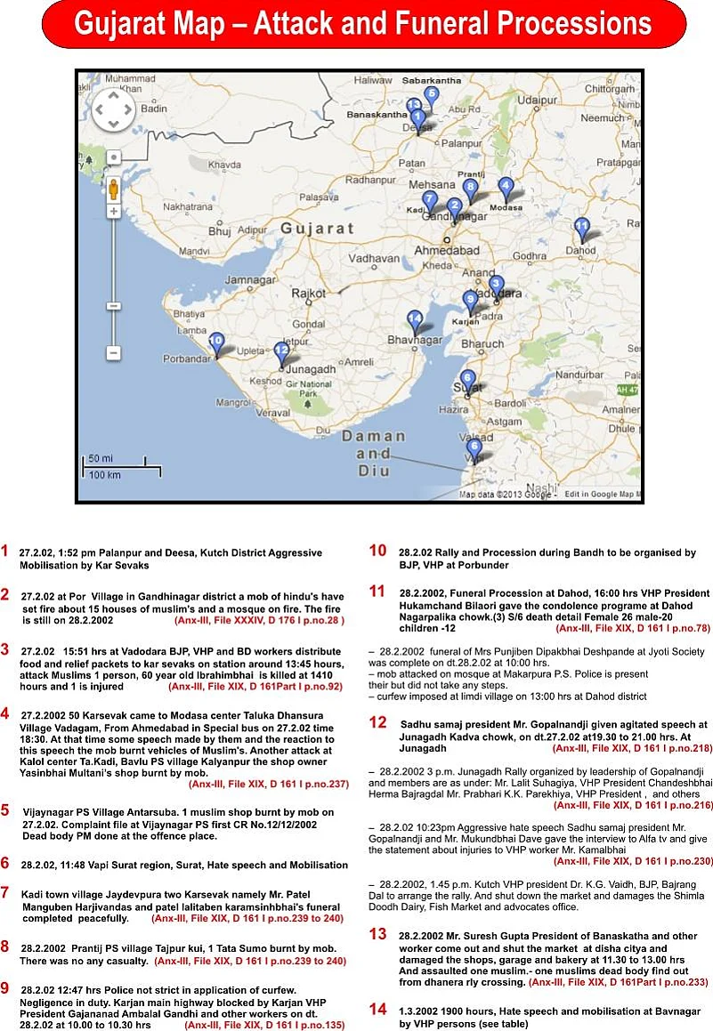 Yet Mr Modi, the entire Home department and the accused under him and individuals accused including Mr Chakravarti (A-25) and Mr PC Pande (A-29) in collaboration with the SIT have strived hard to conceal this evidence. While such aggressive funeral processions were allowed in Ahmedabad, an equally explosive situation prevailed simultaneously in Khedbrahma, Vadodara, Modasa, Dahod, Anand etc. A cynical government under Mr Modi and his co-accused conspirators has done their level best to conceal this evidence.