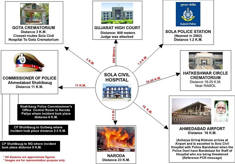 Phone records of the chief minister’s office (CMO) reveal that he went to the airport to catch a helicopter for Godhra via Meghaninagar where the massacre at Gulberg society the next day was organized. Phone records of the CMO also show that after landing in Ahmedabad from Vadodara by aircraft (where he had travelled by road from Godhra on his return journey) too, Mr Modi and officials of the CMO who accompanied him are located at Meghaninagar late evening (mobile phone call records).