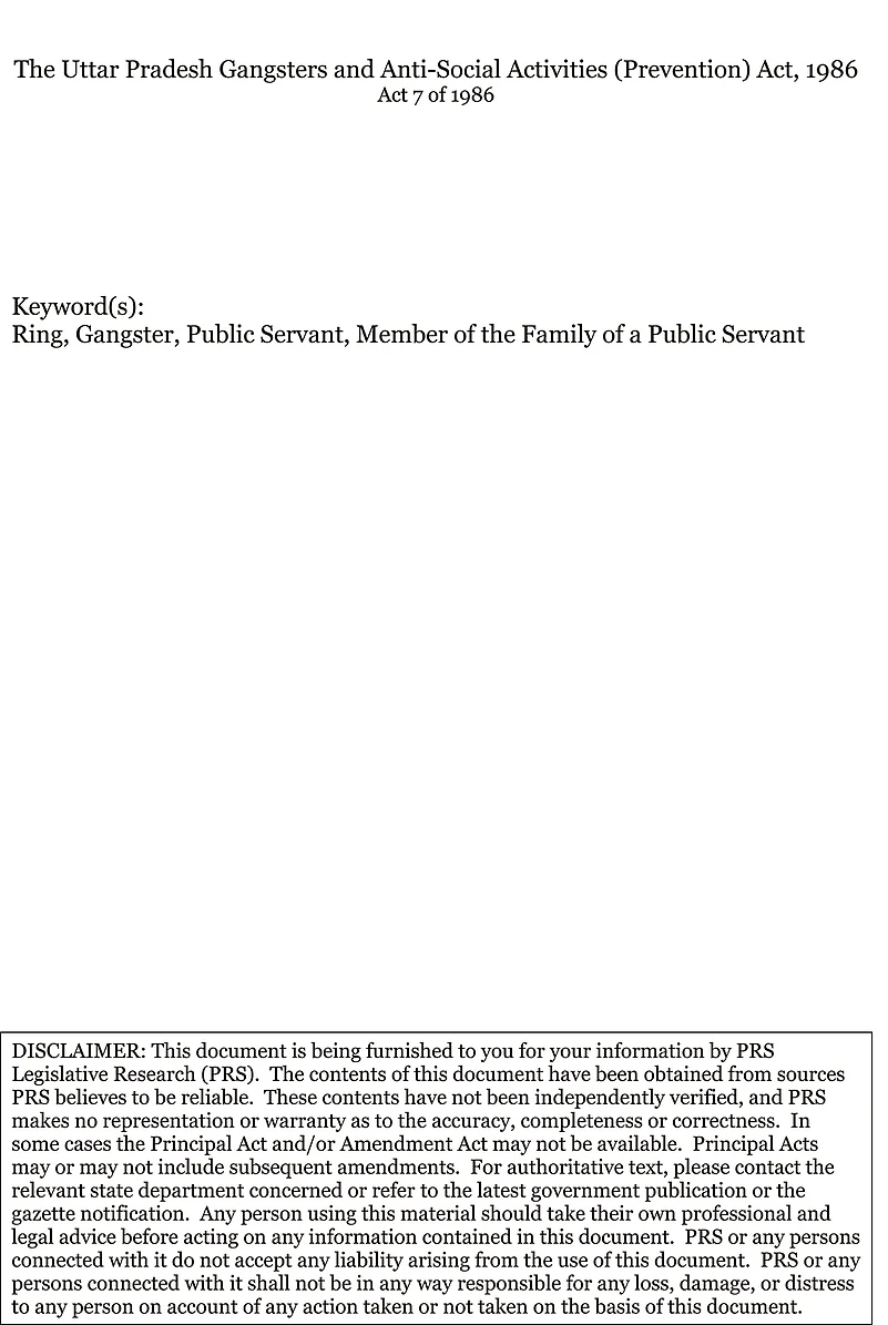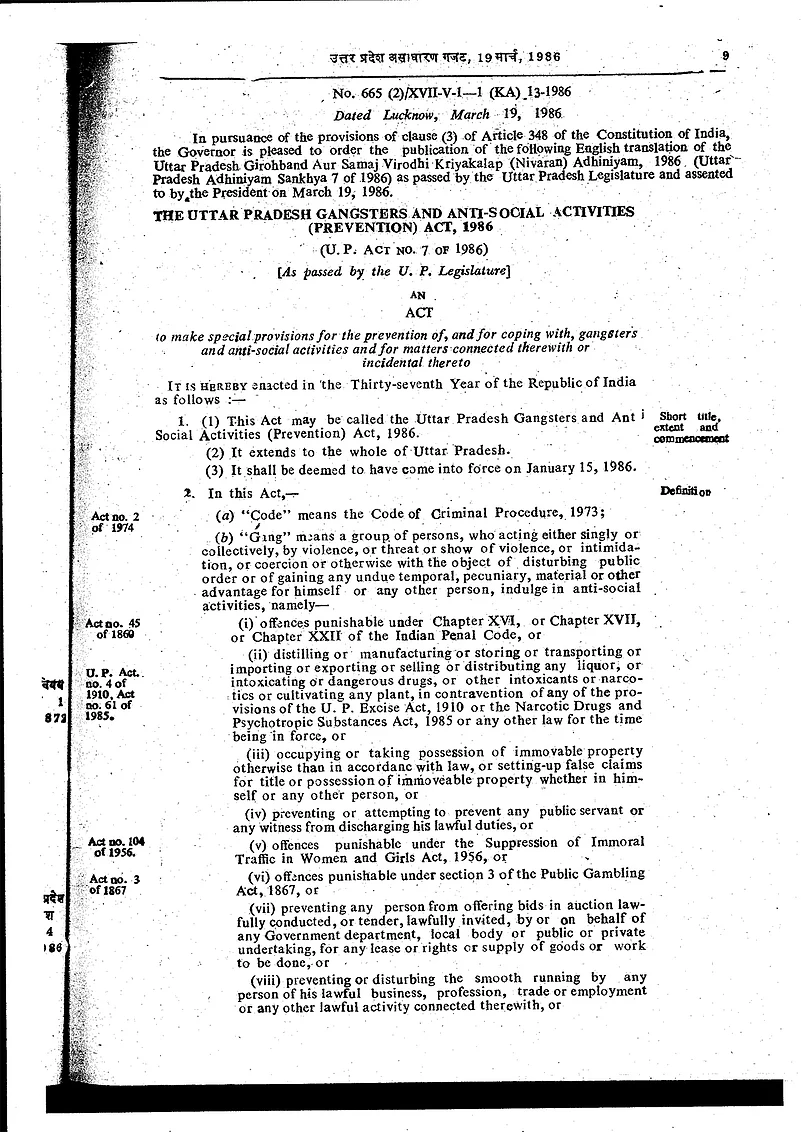 The UP Gangsters and Anti-Social Activities (Prevention) Act, 1986 (Gangsters Act) defines a gangster as a member or leader or organiser of a gang and includes any person who abets or assists in the activities of a gang. According to the Act, a gang is a group of persons who act either individually or collectively by violence or threat or show of violence or intimidation or coercion with the object of disturbing order or gaining any undue temporal, pecuniary, material or other advantage for himself or any other person.