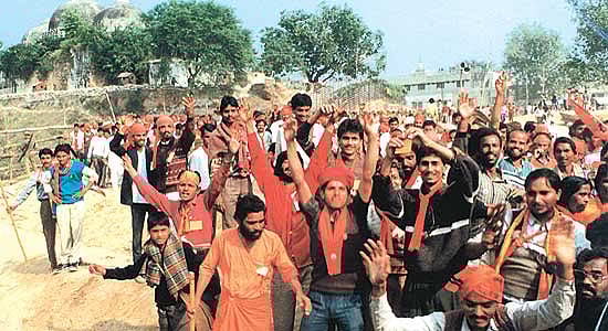 Deputy director, IB, V. Rajagopal, also sent this input on the same day: “A procession of kar sevaks entered the RJB (Ramjanmabhoomi) complex singing songs, dancing and chanting slogans. They carried trishuls and lathis and raised provocative slogans.... The slogans were—Mandir ke nirman mein jo bhi ayega, Ramji ke samne jinda nahin jayega.”