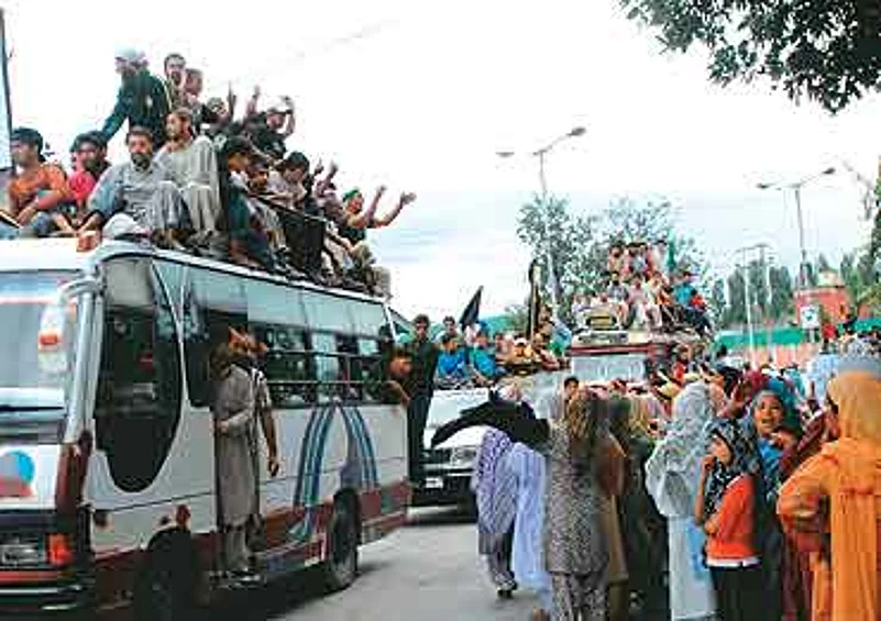 From his magnificent residence on the top of a hillock, with sweeping views of Dal Lake, Governor N.N. Vohra is trying to manage the security arrangements for another mass procession. Should the forces be removed even though the protesters are heading for the UN office in the heart of Srinagar? "We are in a terrible dilemma all the time though we are trying to minimise the conflict and have decided against imposing curfews since people only break them," he says. Isn’t the state government responsible for the mess? "Mistakes were made in handling the Amarnath issue. And the situation has not been helped by the attacks on Muslims in Jammu. They may be just a few incidents but they lead to a great feeling of insecurity in the Valley." That day the administration does indeed decide to keep the security forces only outside high security buildings. The protesters have a free run of Srinagar. They stream in from villages and towns across the Valley shouting azadi slogans.