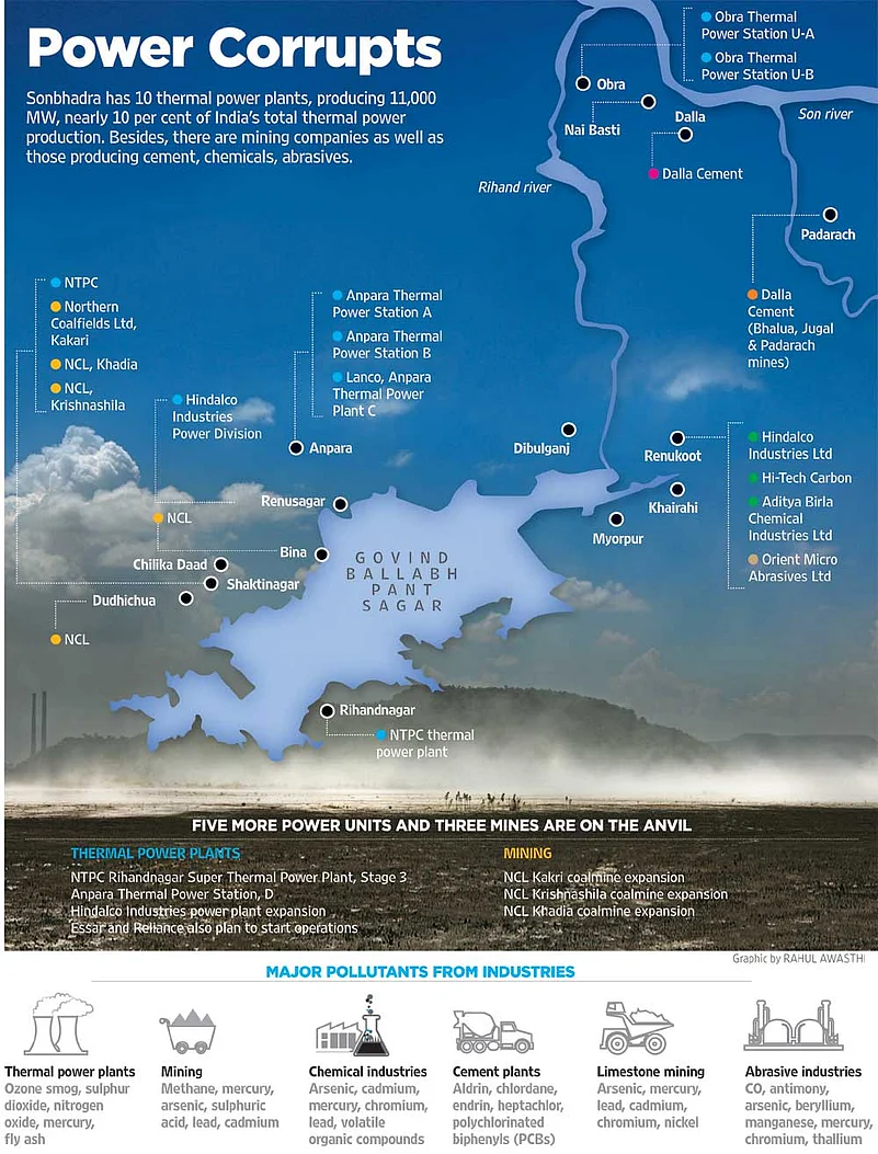 What ails Bagesati? Or indeed Kushmaha, Nai Basti, Gobardaha, Kirwani, Khairahi, Manbasa, Belvad, Pipri-Sonvani, Anpara, Dibulganj and possibly many other villages not visited. For Bagesati, the answer lies 35 km away, in the Obra thermal power plant. For the others, it lies scattered across the 7,000 square kilometres of Sonbhadra, power hub of India. Ten major power plants dot this countryside, leaving it crisscrossed with discoloured streams of blue grey, or of bright orange. Sonbhadra produces some 11,000 MW of power, nearly 10 per cent of the thermal power produced in the country.