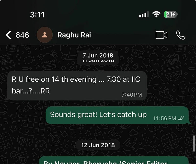 I found a WhatsApp message from June 2018 this morning. R U free on 14th evening... 7.30 at IIC bar...?....RR. He signed it RR. Like a telegram. I had said yes. Something came in the way. Something always comes in the way.
