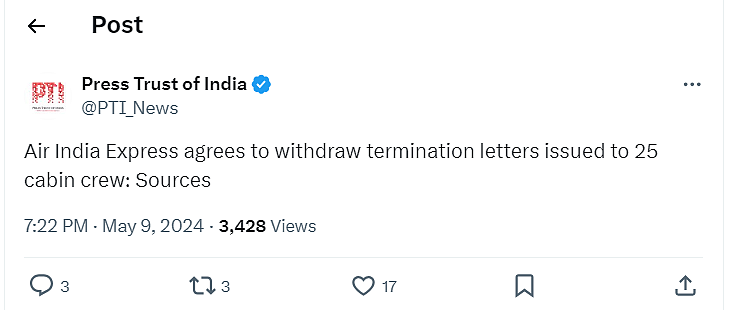 Days after Air India Express' cabin crew went on "mass sick leave", the strike has reportedly been called off. As per PTI, sources have stated that the airline management have agreed to withdraw termination letters issued to 25 cabin crew, thus bringing an end to the strike.