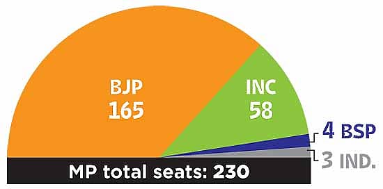 They are calling it the ‘saffron tsunami’. It’s the BJP landslide that blasted all cautious predictions of CM Shivraj Singh Chouhan retaining power with reduced strength. Even Chouhan’s own nervousness, betrayed when he chose to contest from two seats, turned out to be unwarranted. The party went on to increase its vote share by as much as 7.71 per cent, which translated into 22 additional seats and a tally of 165. A poorly-led, fractious Congress could only muster 58, down from 71 in 2008.
